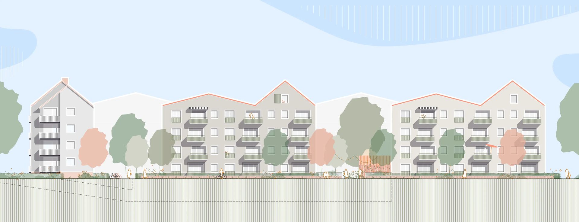 Und nach dieser Entscheidung? Jedenfalls kein Ende der von uns geforderten konzeptionellen Überarbeitungen. Neben den vielen Optimierungen der Wohnungsgrundrisse und erfolgreicher Prüfung auf Entfall eines kostspieligen Kellers prüften wir noch die Anregung aus dem Wettbewerb, ursprünglich vorgesehene Abstände zu den Neubauten auf dem Tankstellengrundstück kurzerhand baulich aufzufüllen. Dadurch wurde es möglich, ohne Wohnflächenverlust auf ein im Zuge der Nachverdichtung vorgeschlagenes Gebäude ganz zu verzichten, da die Abstände zu den bestehenden Gebäuden recht gering gewesen wären. So konnten wir die Wohnqualität im Bestand sichern und gleichzeitig größere Wirtschaftlichkeit durch bessere Auslastung der geplanten Treppenhäuser und Aufzüge bei den Neubauten erreichen. Was will man mehr?