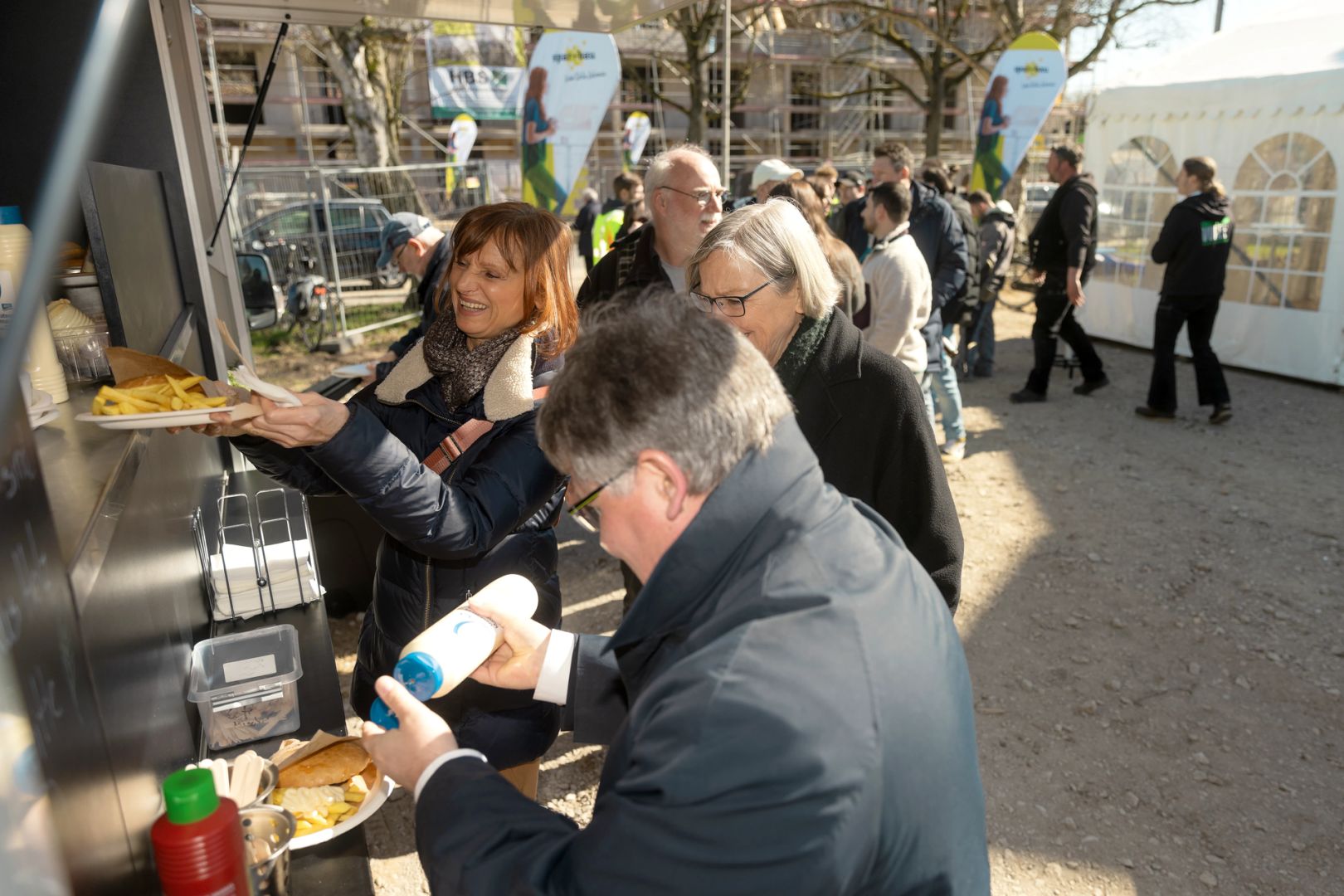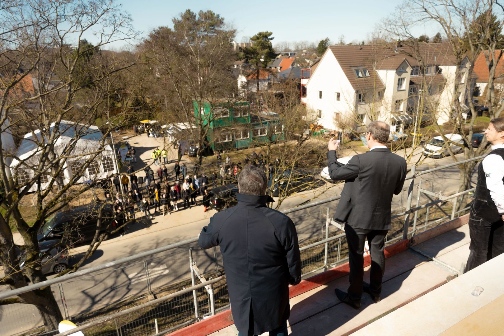 Für die feierliche Rede beim Richtfest stieg spar+bau-Vorstand Rainer Detjen auf das Gerüst des Rohbaus und bedankte sich herzlich bei allen Beteiligten. Detjen lobte den reibungslosen Baufortschritt und den gelungenen Entwurf: „Grundlegende Idee des Gebäudes ist die Laubengangerschließung, sodass dort Kommunikationsflächen entstehen. Denn das ist es ja, was eine Genossenschaft ausmacht: das Gemeinsame, das Miteinander, das Zueinanderfinden.“